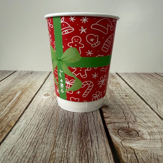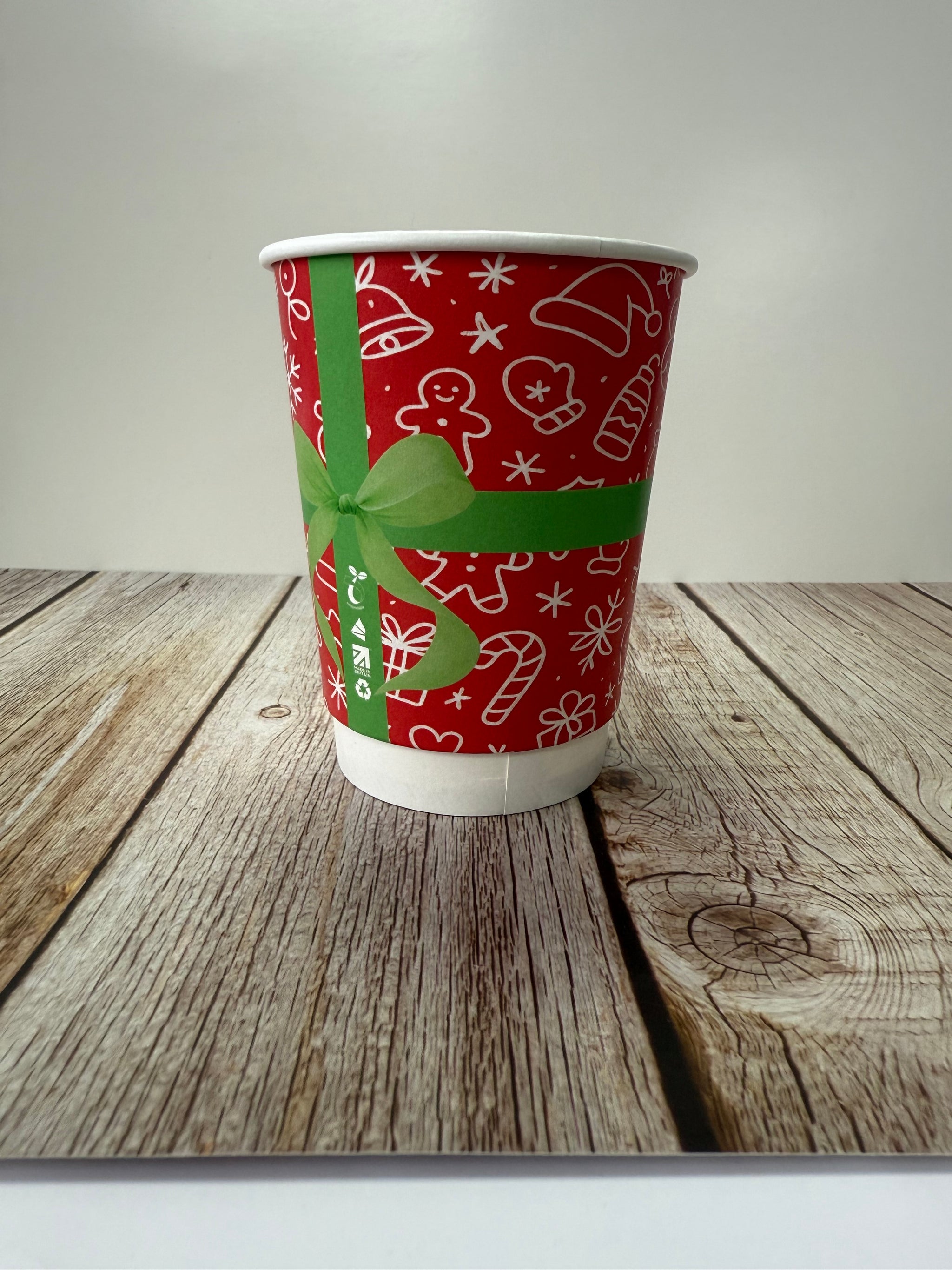 12oz double wall paper coffee cup. Holiday design. Made on Delipac material (recyclable in any waste stream, compostable, home compostable, PFAS free, Flustix accredited).