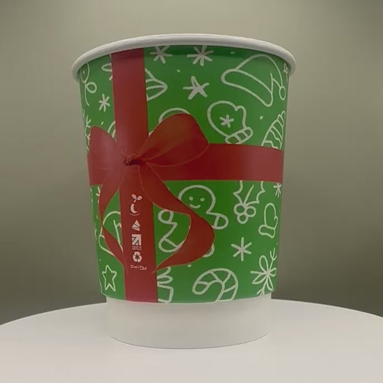 8oz Double wall paper coffee cup. Holiday Design. Made on Delipac material (recyclable in any waste stream, compostable, home compostable, PFAS free, Flustix accredited).